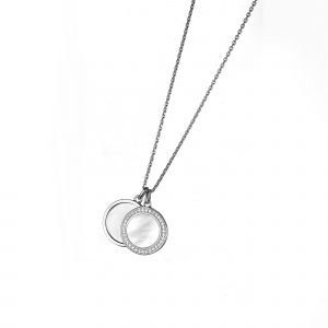 Durchmesser der Anhänger je 15mm. Ein Anhänger mit mehreren Zirkonia bestetzt und Perlmutt Einlage, der zweite Anhänger ist gebürstet und kann mit einer Gravur versehen werden.