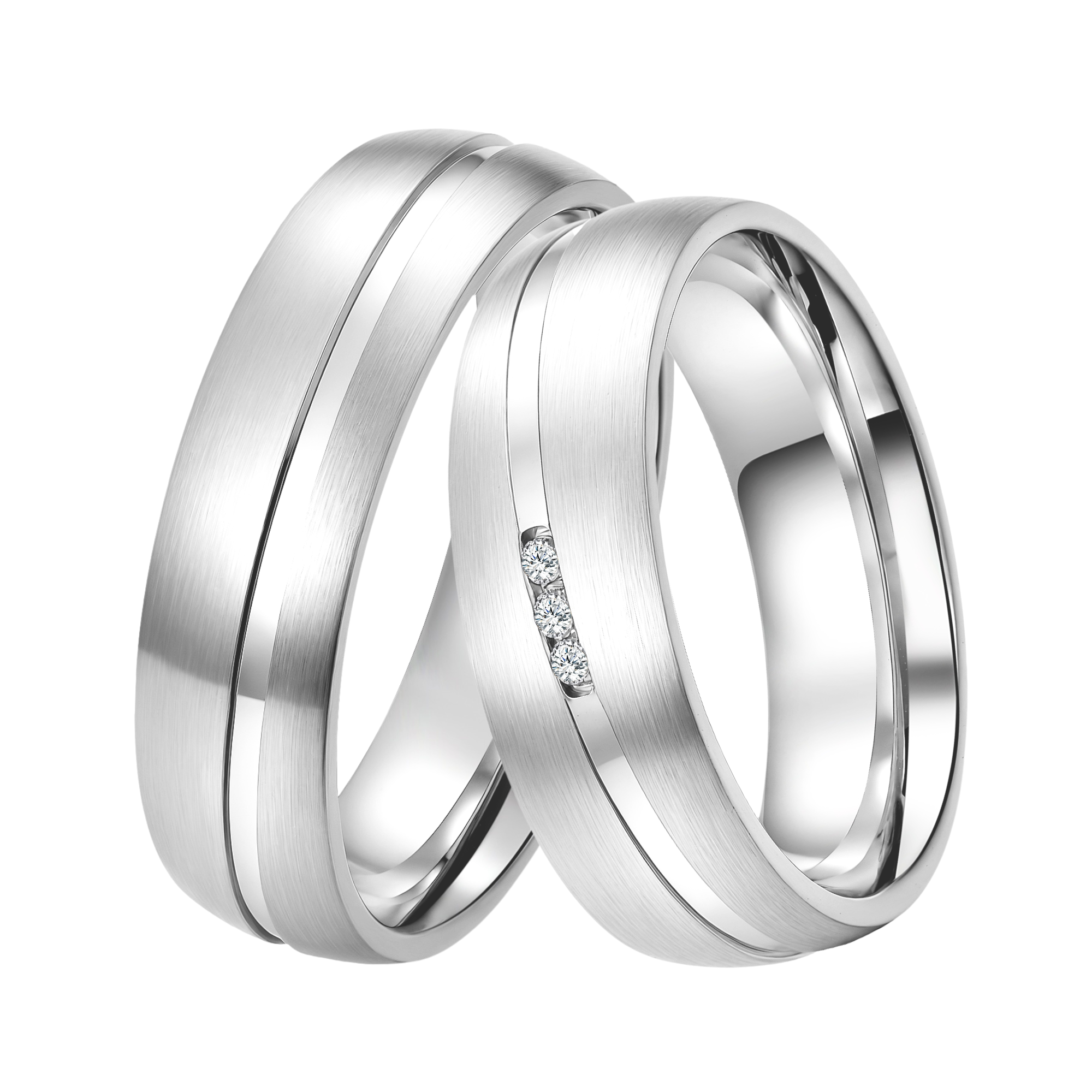 Hochwertiges Paar Silberringe aus 925/- Silber gefertigt. Die Oberflächen sind gebürstet, poliert und rhodiniert. Innen sind die Ringe für einen besseren Tragekomfort bombiert.