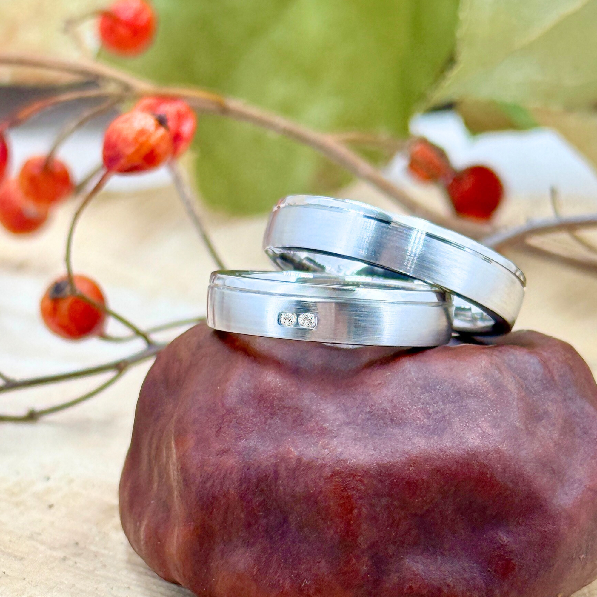 Hochwertiges Paar Silberringe aus 925/- Silber gefertigt. Die Oberflächen sind gebürstet, poliert und rhodiniert. Innen sind die Ringe für einen besseren Tragekomfort bombiert.