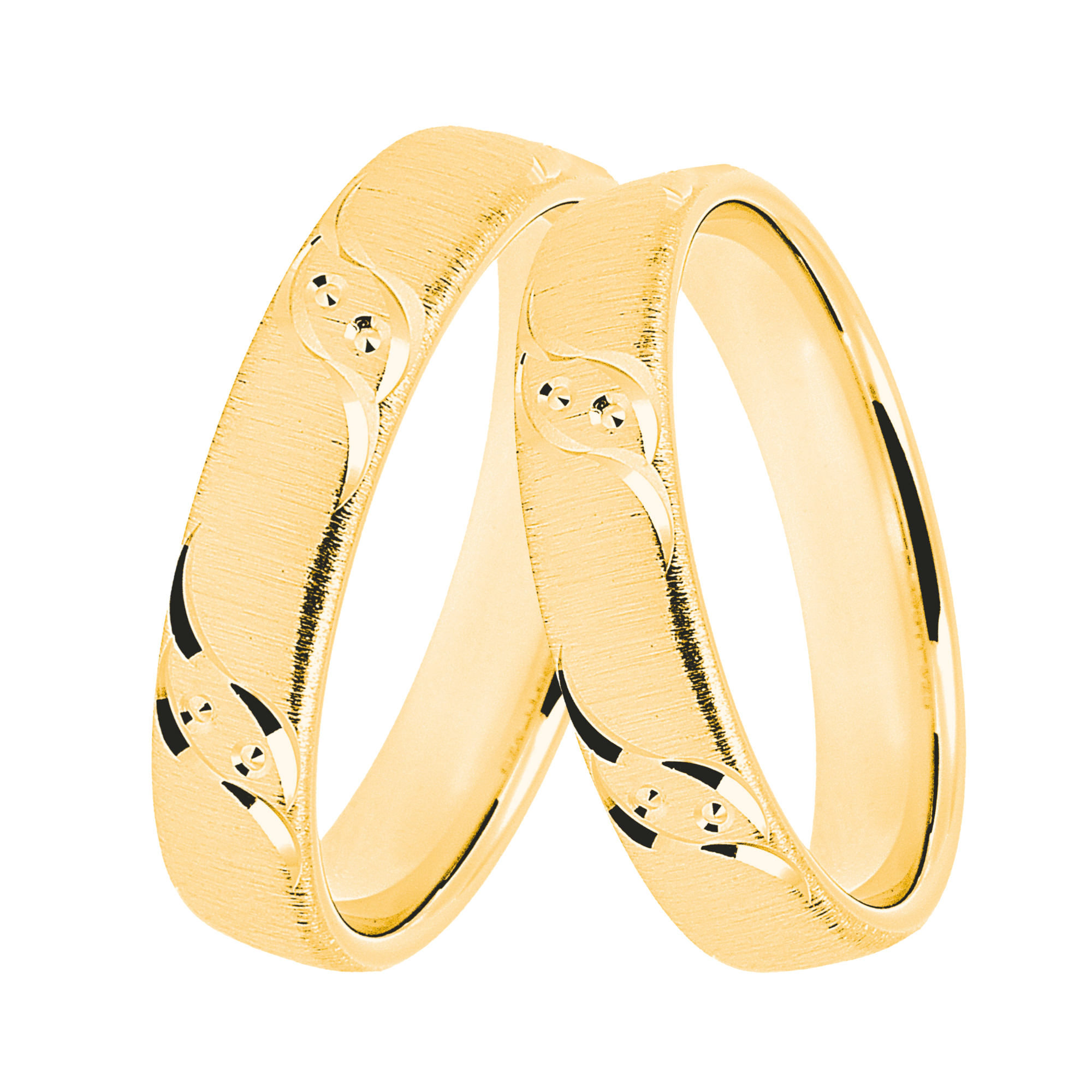 Hochwertiges Paar Silberringe aus 925/- Silber gefertigt. Die Oberflächen sind gebürstet und mit 3 Mikron Gelbgold hochwertig vergoldet, die Fugen sind poliert. Innen sind die Ringe für einen besseren Tragekomfort bombiert.