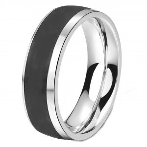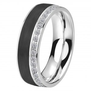 Schwarze, seidenmatte Carbon-Einlagen manifestieren sich in diesem aus chirurgischen Edelstahl hergestellten Ringpaar. Dort, wo beim Ring ohne Stein eine Hochglanz polierte Außenlinie den Ring ziert, schmückt eine umlaufende Linie aus funkelnden Zirkoniasteinen den Ring mit Stein und verleiht ihm so einen femininen Touch. Innen sind die Ringe für einen besseren Tragekomfort bombiert.
