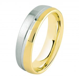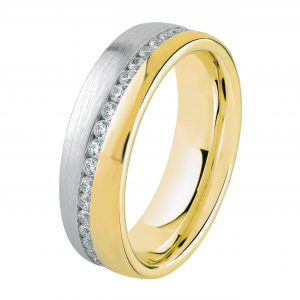 Hochwertiges Paar Partnerringe/Trauringe aus 925/- Silber gefertigt. Die Innenseiten und Oberflächen sind mit 3 Mikron Gelbgold vergoldet (poliert) und längst gebürstet. Der Ring mit Stein ist mit schräg umlaufenden Zirkonia besetzt. Eine Hochglanz polierte Zierlinie umläuft den Ring ohne Stein. Innen sind die Ringe für einen besseren Tragekomfort bombiert.