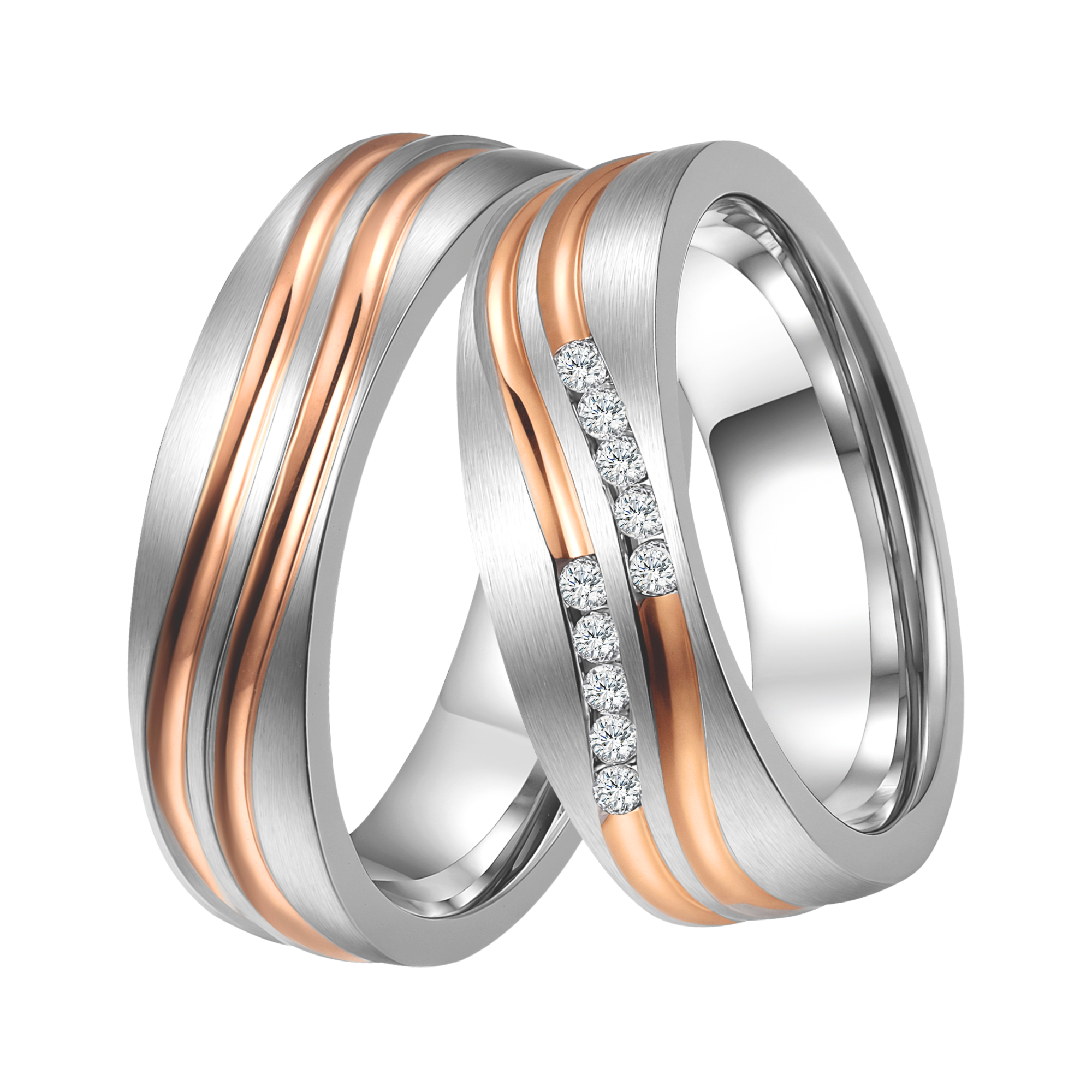 Hochwertiges, aus Edelstahl gefertigtes, Paar Freundschaftsringe / Partnerringe. Die Oberflächen sind gebürstet, die Fugen Rosegold beschichtet (poliert). Der Ring mit Stein ist mit 10 Zikonia besetzt. Innen sind die Ringe für einen besseren Tragekomfort bombiert.