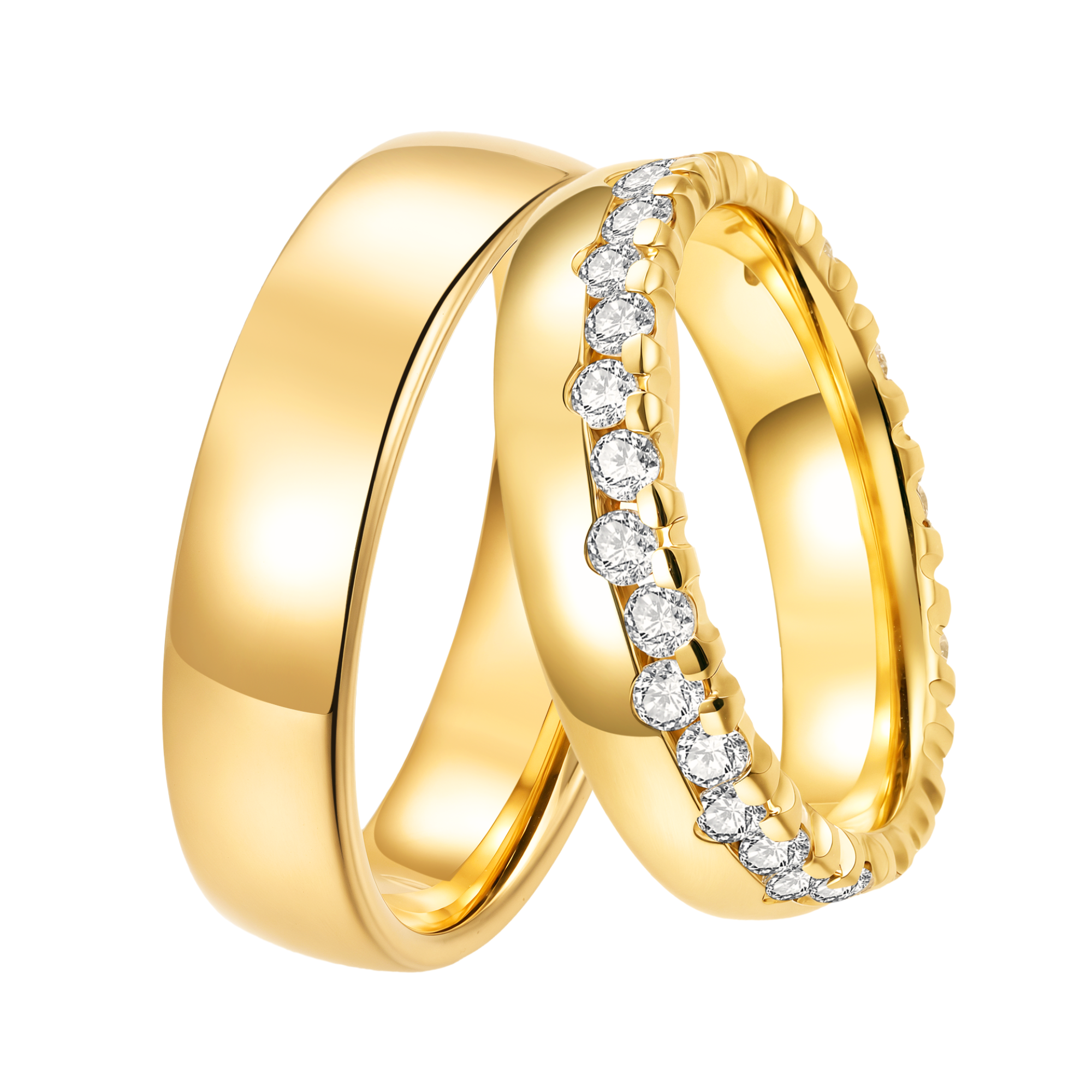 Hochwertiges Paar Silberringe aus 925/- Silber gefertigt. Der Ring mit Stein ist mit ca. 40 Zirkonia-Steinen von Hand gefasst. Die Ringe sind poliert und mit mit 3 Mikron Gelbgold hochwertig vergoldet